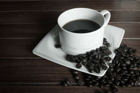 Black coffee in white cup and coffee bean on wood table background.