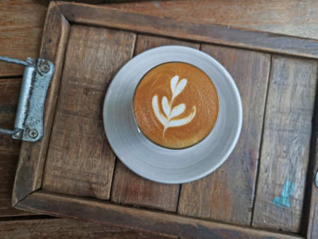 A cup of coffee latte top view with leaf shape foam