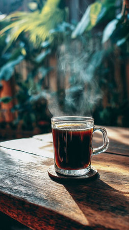 Cup of coffee with smoke on the wooden table in the garden