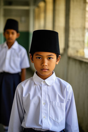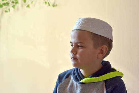 Portrait image of young muslim boy wearing traditional islamic prayer cap. place to put text in image