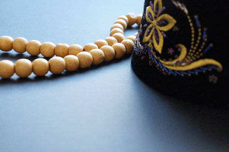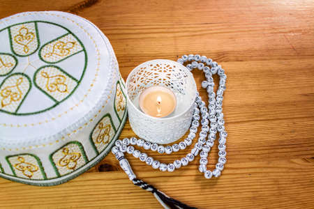 wooden rosary for prayer and embroidered skullcap on dark background.