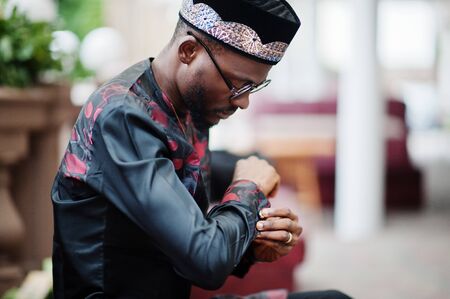 Handsome afro american man wearing traditional clothes, cap and eyeglasses in modern city sitting at couch.