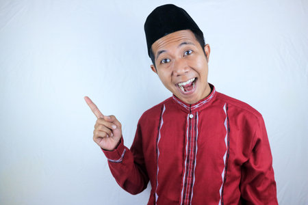 Smiling expression of muslim asian man, pointing finger an empty space. Advertising concept