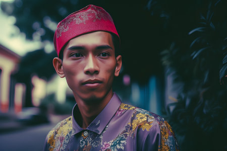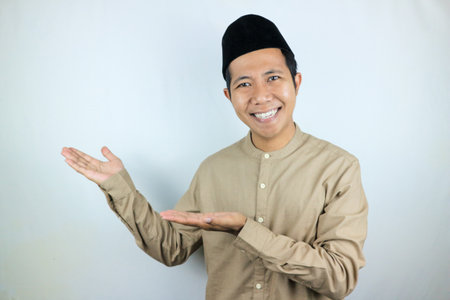 Portrait of a handsome young asian muslim man wearing traditional clothes