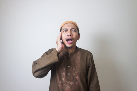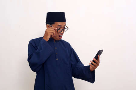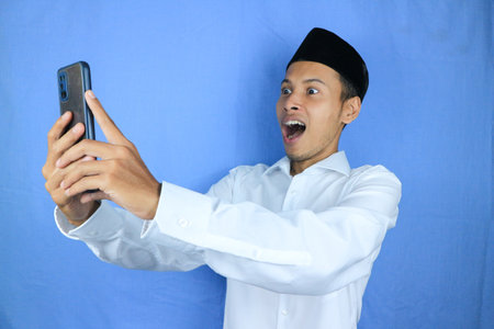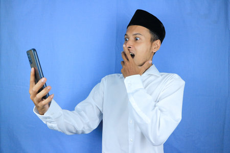 funny facial expression of asian muslim man wearing cap shocked looking at phone screen