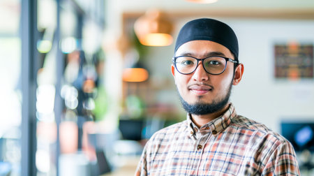 A young Muslim entrepreneur at a co-working space, blending modern business practices with traditional ethical values.