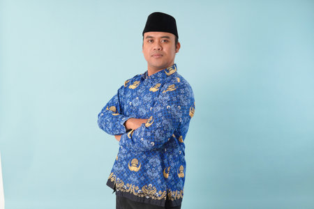 Smiling government worker man wearing kopri blue batik uniform He is posing for a picture PNS, ASN civil servant concept.