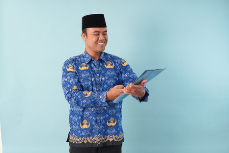 government worker man wearing kopri blue batik uniform holding a clipboard. Concept of professionalism and confidence,. PNS, ASN civil servant concept.