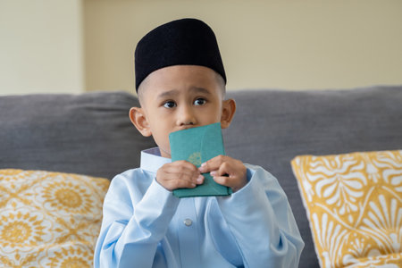 Eid Mubarak celebration moment, Young Malay boy holding Eid cash money envelop