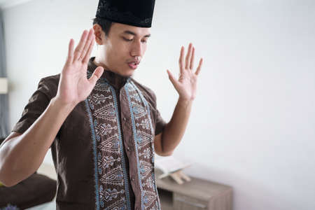 Young Muslim man praying at home