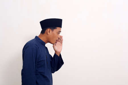 Portrait of Asian muslim man in white koko shirt looking down below. Isolated in blue background