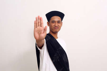 Asian muslim man shows stop hand sign gesture. Isolated on white background
