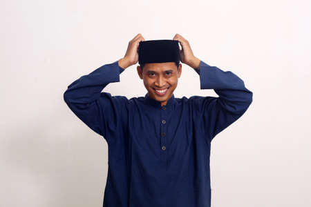 Portrait of happy asian man using cap. Isolated on white background. Ramadan concept