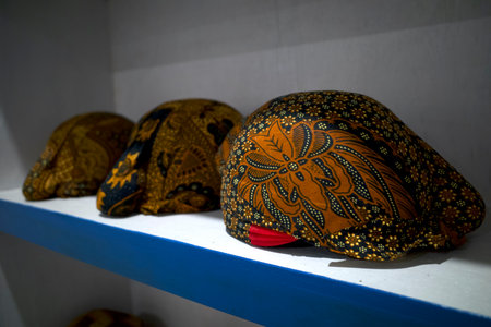 Colorful Blangkons, a traditional Javanese headgear made of batik fabric on the shelf.