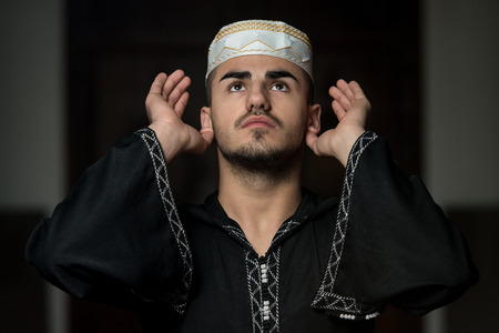 Young Muslim Guy Making Traditional Prayer To God While Wearing A Traditional Cap Dishdasha