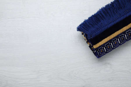 Muslim prayer rug on wooden floor, top view. Space for text