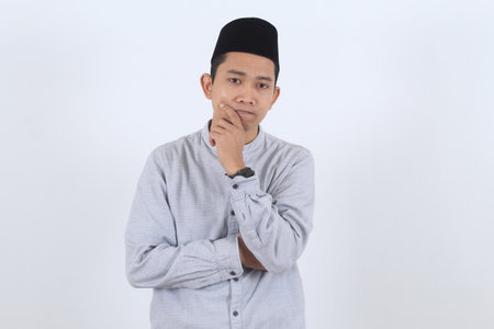 Portrait of a thoughtful young Indonesian Muslim man pondering a decision. He looks serious and contemplative, considering a solution to a problem.
