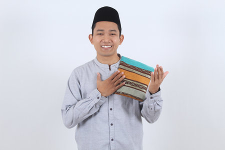 Joyful Asian man in traditional Islamic clothing holding a prayer mat, celebrating Eid al-Fitr or Ramadan Kareem on a white background.