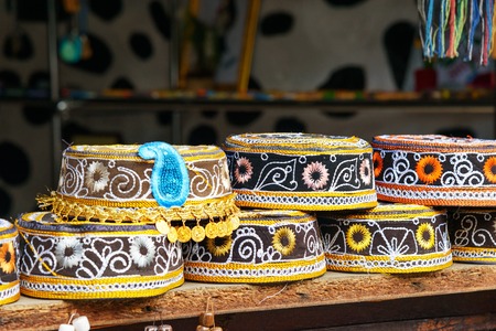 Taqiyah, rounded skullcap. Traditional muslim hats sold on a local market. Sheki, Azerbaijan
