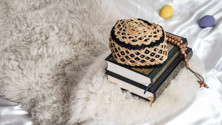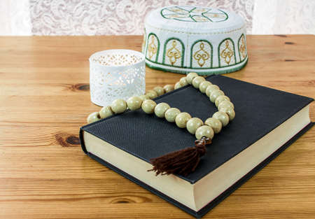 Quran or Kuran ( the islamic holy book) on white background with rosary bead ready to read in ramadan night, muslim style and ramadan concept
