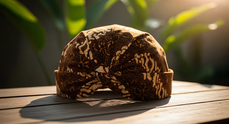 A traditional Javanese head covering, known as a blangkon, is displayed on a wooden table with a soft, sunlit background. The headwear is made from classic brown and cream-colored batik fabric with intricate patterns. This image represents Indonesian culture, tradition, and craftsmanship.