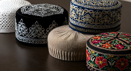 A collection of various traditional Muslim prayer caps, including embroidered taqiyahs and a knitted kufi. The hats showcase different intricate patterns, colors, and materials, representing Islamic culture, faith, and diversity.