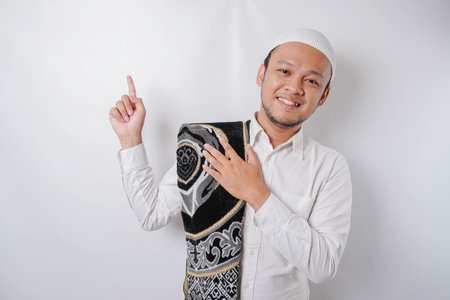 Smiling Asian Muslim man with prayer rug on his shoulder is pointing at the copy space on top of him, isolated by white background