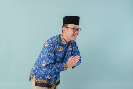 Cheerful Indonesian government worker man wearing blue batik uniform doing greeting gesture while smiling at camera. PNS and civil servant concept.