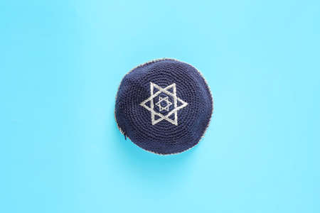 Jewish cap on color background