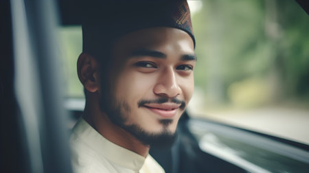 Portrait of a young Muslim man sitting in a car and smiling