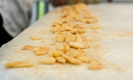 Making lazy dumplings. Cut dough and flour on wooden board, closeup
