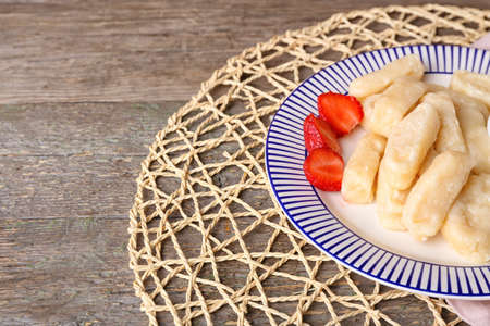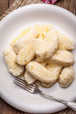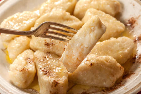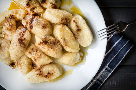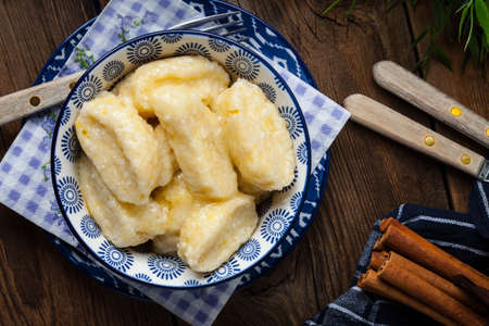 Lazy dumplings with butter and sugar on a wooden table.