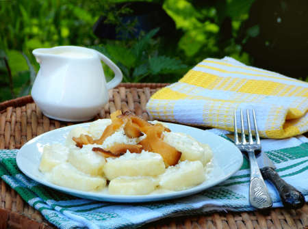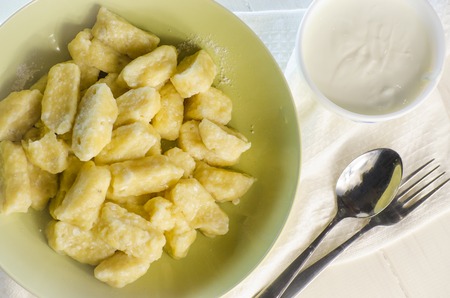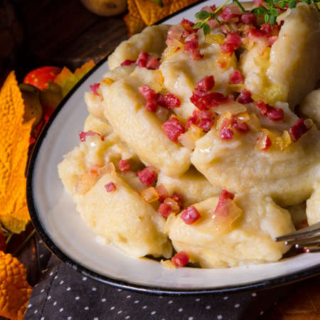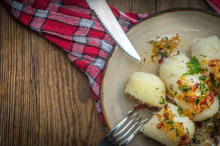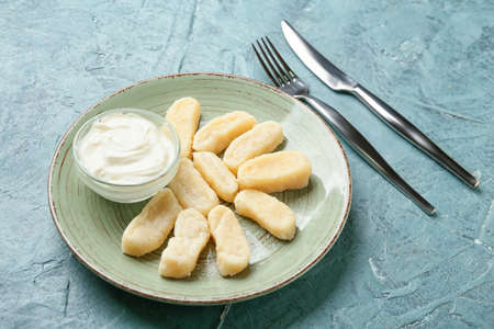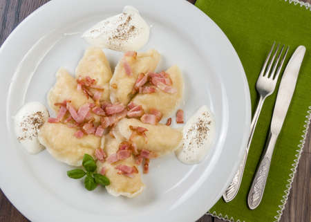 Lazy pierogi, dumplings with sour cream, cheese and bacon. Italian gnocchi