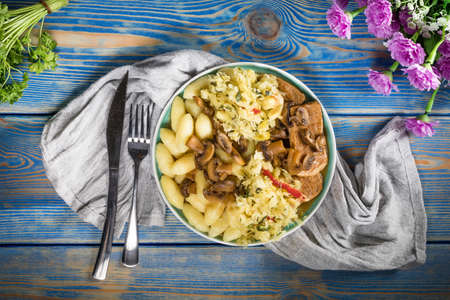 Tasty meat in creamy sauce with mashed potatoes and vegetables. Food and drink concept.
