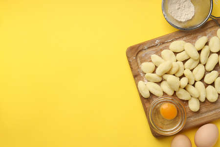 Concept of cooking with raw potato gnocchi, space for text