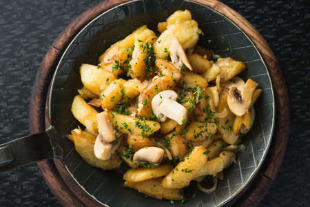 fried potatoes with mushrooms in a pan