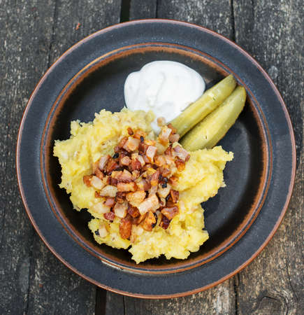 Estonian national dish. Potatoes with bacon and pickled cucumber.