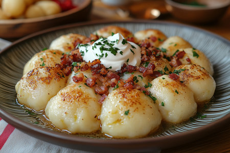 Lithuanian cepelinai - potato dumplings - served on a plate, topped with crispy bacon bits and sour cream, with a traditional tablecloth and natural light