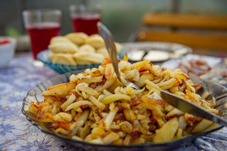 dish with fried potatoes stands on a table outdoors on a sunny day. Cooking food.