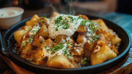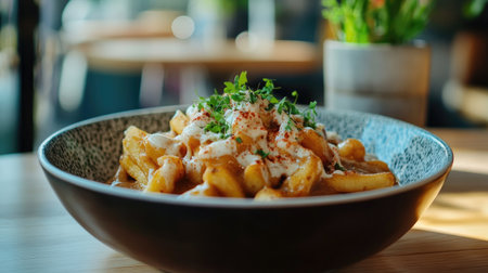 Enjoy a delectable bowl of poutine featuring golden fries topped with creamy sauce and fresh herbs. Perfect for any comfort food lover seeking an indulgent treat.