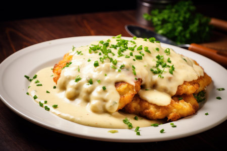 Velvety Schnitzel bechamel sauce. Chop with the sauce in the plate on the table. Generate AI