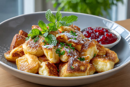 Kaiserschmarrn with powdered sugar, mint, chives, served with cranberry jam