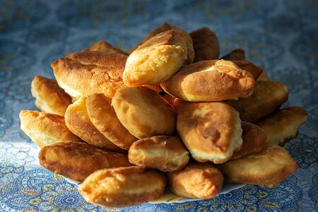 A lot of fried pies on a plate, on a background of blue tablecloth.
