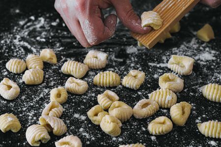 homemade potato gnocchis handmade with flour and egg on a black table