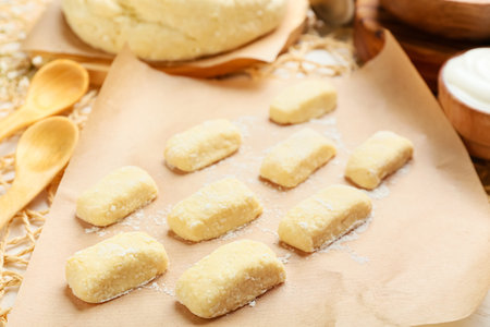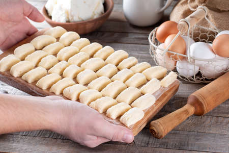 Making traditional russian, ukrainian cottage cheese lazy dumplings, raw dumplings on wooden board