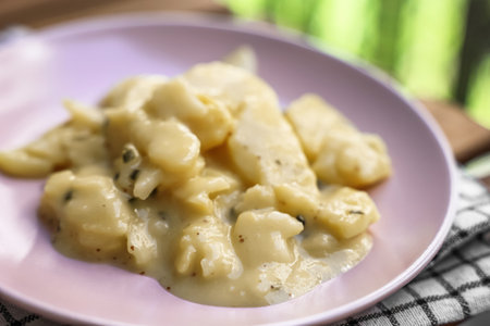 Plate with creamy potato salad on table, closeup