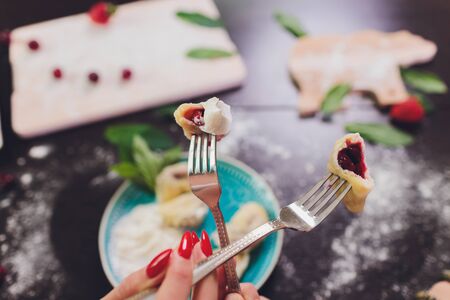 Concept of tasty food with vareniki or pierogi