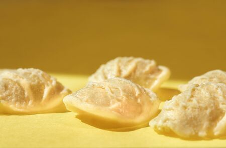 Raw dumplings or vareniks, traditional Russian and Ukrainian food, close up