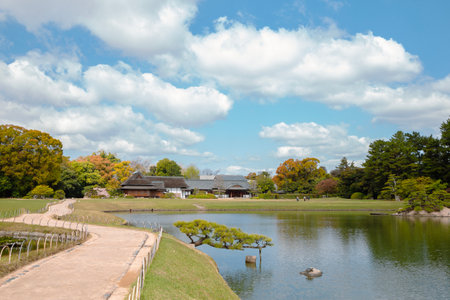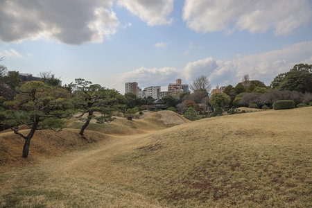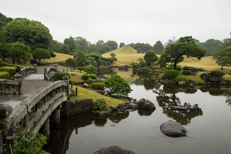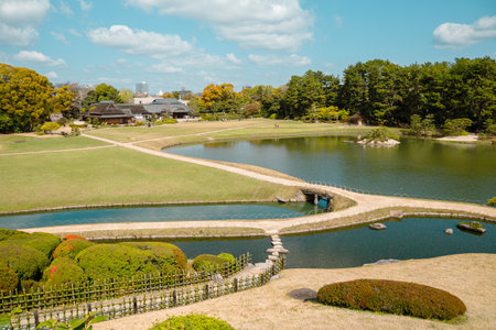 Traditional Japanese Garden with Kayo-no-ike Pond in Okayama Korakuen Park in Japan.Horizontal Image Composition