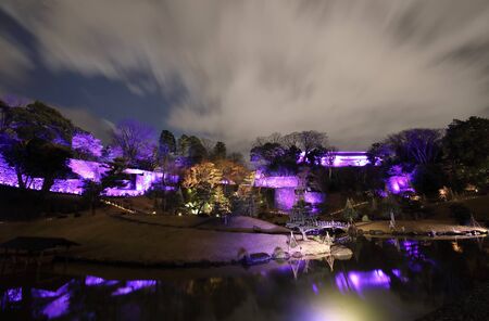 Autumn night light-up of big pine trees in a garden with Rikugien in Tokyo Japan.